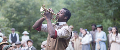 Stitching together these vignettes are dreary interstitial scenes of Bolden locked up in a mental institution. They are cloaked in dingy green and black, interrupting the flow of the brighter colors of happier memories. Bolden’s nostalgic trip is in part caused by listening to Louis Armstrong play on the radio. He wanders the halls in a daze, still half-heartedly looking for an escape. It’s as if he still had music left to play. The scenes with Armstrong playing in front of a segregated white audience while his Black fans listening outside is perhaps the most vibrant moments in the movie. It’s the kind of future that Bolden never got to enjoy in his lifetime.