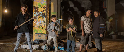Our story is set in one of these cities, where children have been orphaned by the violence that surrounds them, forming a sort of “lost boys” group of their own on a rooftop. They steal food and the supplies to keep them alive, and they’re led by an angry young man named Shine (Juan Ramon López). In an early scene, Shine steals a phone and a gun from a local thug named Caco (Ianis Guerrero), and nearly shoots him in the back. Not long after this decision, a quiet girl named Estrella (the incredible Paola Lara, whose commitment holds the whole film together) comes home after a school shooting to find her mother is missing. She joins Shine’s gang, and they tell Estrella that her mother was likely kidnapped and either trafficked or murdered. And then Caco and his men come looking for his phone.
