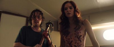“Harpoon” begins life on dry land, though, as it introduces its three key figures. Jonah (Munro Chambers) and Richard (Christopher Gray) are best friends, although they couldn’t be more different. Jonah is an average-looking, middle-class sad sack who’s in the process of packing up his parents’ house after their deaths. Richard is a rich, pretty-boy hothead who’s frantically speeding over to that house to confront Jonah with some jealous accusations. In between them is Sasha (Emily Tyra), Richard’s beautiful and elegant girlfriend who also functions as a mother figure to Jonah. She’s both the disruptor and the peacemaker. They’ve all settled into their assigned roles in this dysfunctional triangle, but that bond is about to be tested.